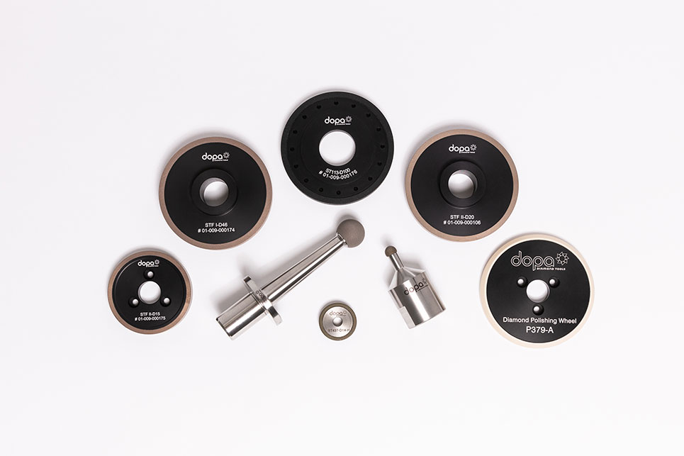 We have developed a special hybrid bond for this application. It’s composition combines the benefits of metal bonded tools (cutting performance, endurance and good cooling properties) and resin bonded tooling (homogeneous scratch-free surfaces, very low sub surface damage, optically measurable after grinding, reduced polishing times).
